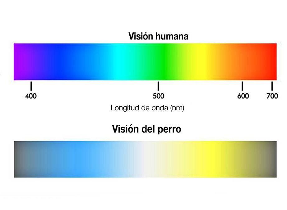Según varios estudios, el perro es capaz de distinguir varios matices del azul, el amarillo y el gris.[1][2][3] Por el contrario, no son capaces de distinguir el verde, el rojo, el rosa o el púrpura. Aunque a priori no resulte destacable, lo cierto es que se trata de un hecho sorprendente si consideramos que la mayoría de productos para mascotas son de color rojo. Eso es debido a que se eligen pensando en los compradores: los humanos.