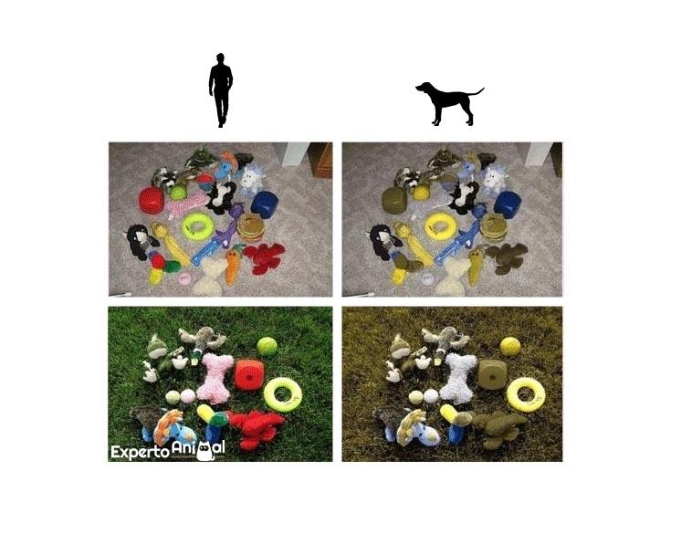 Se puede observar claramente cómo el perro sería capaz de discriminar el color amarillo y el color azul, no obstante, el rojo, el verde o el naranja adquirirían una tonalidad grisácea o marrón que impediría diferenciarlos al 100% de la hierba, por ejemplo. Por esa razón, en el caso de querer utilizar juguetes o herramientas para ejercicios de discriminación es recomendable apostar por el azul y el amarillo, que son los colores más llamativos para el perro.