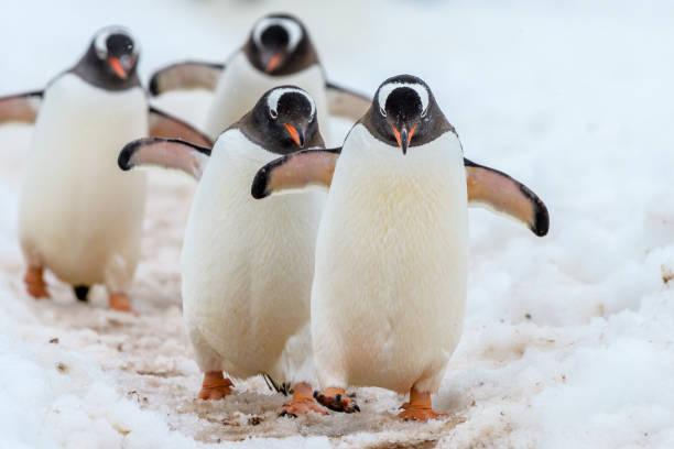 A pesar de vivir en el hemisferio sur, donde las bajas temperaturas son lo habitual, cuando llega el invierno los pingüinos migran hacia zonas de más calidad para sobrevivir. También migran cuando la cantidad de alimento comienza a escasear en ciertas épocas del año, o para encontrar mejores condiciones durante la temporada de reproducción. Esto lo hacen mediante largas caminatas que pueden tomarles casi 100 días o nadando.