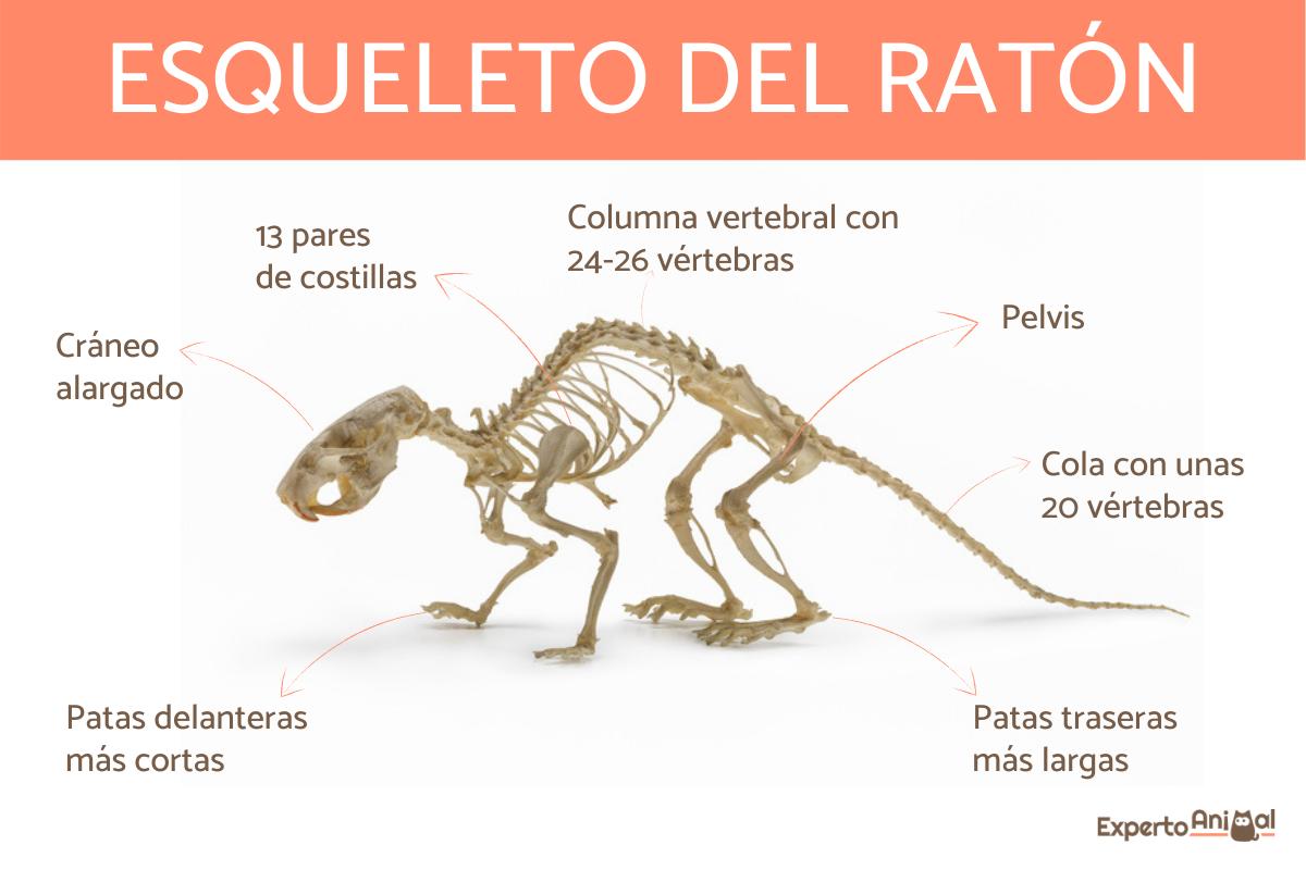 El esqueleto de los ratones es muy similar al del cualquier otro mamífero y sobre todo al de cualquier otro roedor, pues cuenta con un cráneo alargado, una larga columna vertebral formada por gran número de vértebras, cuatro patas marchadoras o extremidades que constan de húmero, cúbito y radio, y fémur, tibia y peroné, una serie de falanges y otras estructuras óseas como las costillas o la pelvis. Estas son las principales funciones realizadas por algunos de los huesos presentes en los ratones: