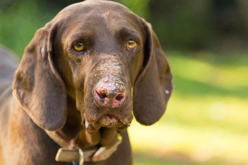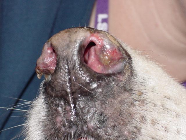 Además, aparecen lesiones en la piel tipo úlcera, sobre todo en la zona de la cara, especialmente en la trufa, y las patas, en concreto en las almohadillas, que se engrosan, se ulceran e incluso, en los casos más graves, pueden llegar a caerse. También pueden infectarse el área que rodea a las uñas, que incluso se desprenden. Los problemas de la piel evolucionan desde erosiones a costras y pérdida de pelo. El primer síntoma puede ser una cojera que va cambiando de pata o un andar tambaleante.