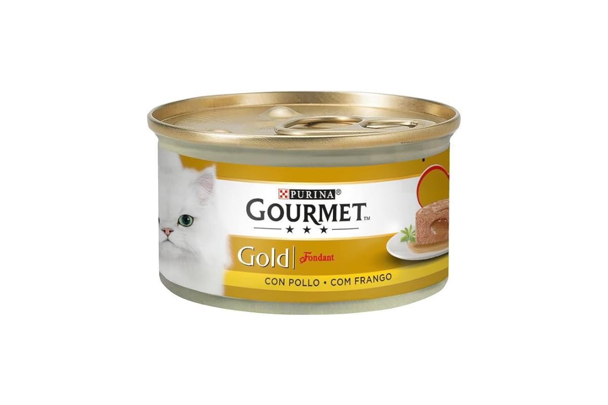Otro alimento blando para gatos sin dientes puede ser la gama de Purina llamada "Gourmet Purina Gold Fondant". Consiste en una latita que contiene una mousse que podemos encontrar de varios sabores como pollo, salmón o buey y que contiene líquido en su interior, por lo que el gato sin dientes podrá morder la parte del exterior que es blanda hasta llegar al corazón, líquido, suave y sabroso, no dándole ningún problema a nuestro gato sin dientes.