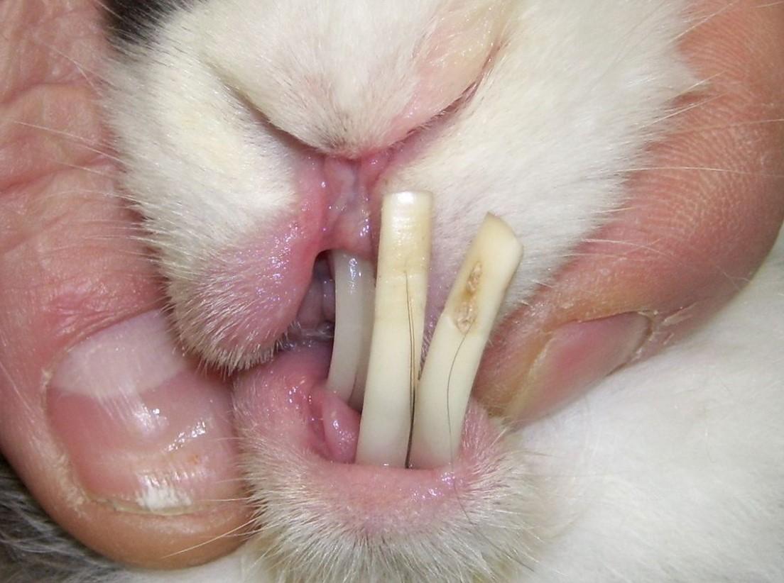 - Dientes desalineados: el sobrecrecimiento dental provoca daños y heridas en las encías, paladar o en los labios. La mala oclusión de los incisivos es la más común y más fácil de detectar por parte de los propietarios que no la de los molares o premolares. Muchas veces los propietarios acuden a la consulta porque su mascota está delgada o apenas come, sin prestar atención al estado de los dientes.