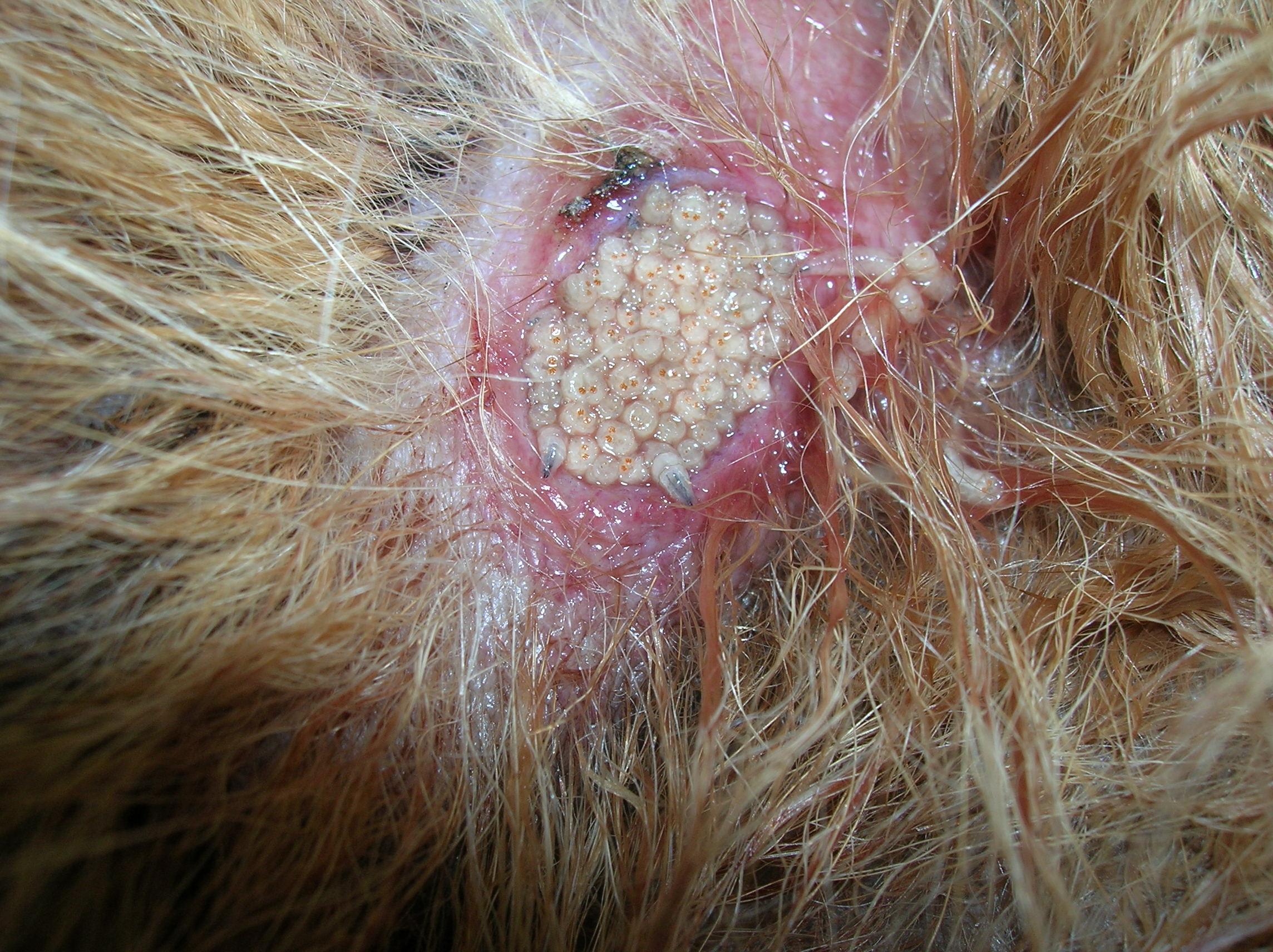 No obstante, es más común ver heridas con gusanos en los gatos que en los huevos. Son heridas en carne viva, infectadas o fistulizadas y esos gusanos que se ven son las larvas. Otros lugares donde podemos encontrar estas larvas son el interior de las orejas y el ombligo en los gatitos recién nacidos. Así, se verán más afectados los gatos con acceso al exterior o aquellos con lesiones o un peor estado de salud.