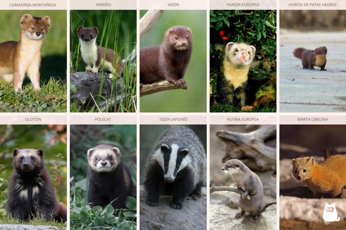 - Hurones: entre ellos se encuentra el hurón europeo (Mustela putorius). Los hurones son conocidos por su domesticación, además de que están estrechamente emparentados con las comadrejas. Como curiosidad, suelen nacer y criarse como animales domésticos pero también se utilizan para la caza de conejos.