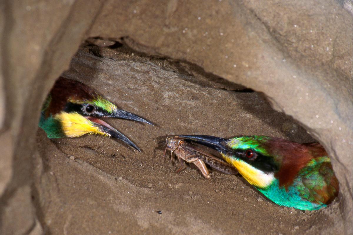 - El abejaruco europeo cava madrigueras subterráneas de aproximadamente 1 m de profundidad en taludes de arena o en las riberas escarpadas de ríos.
