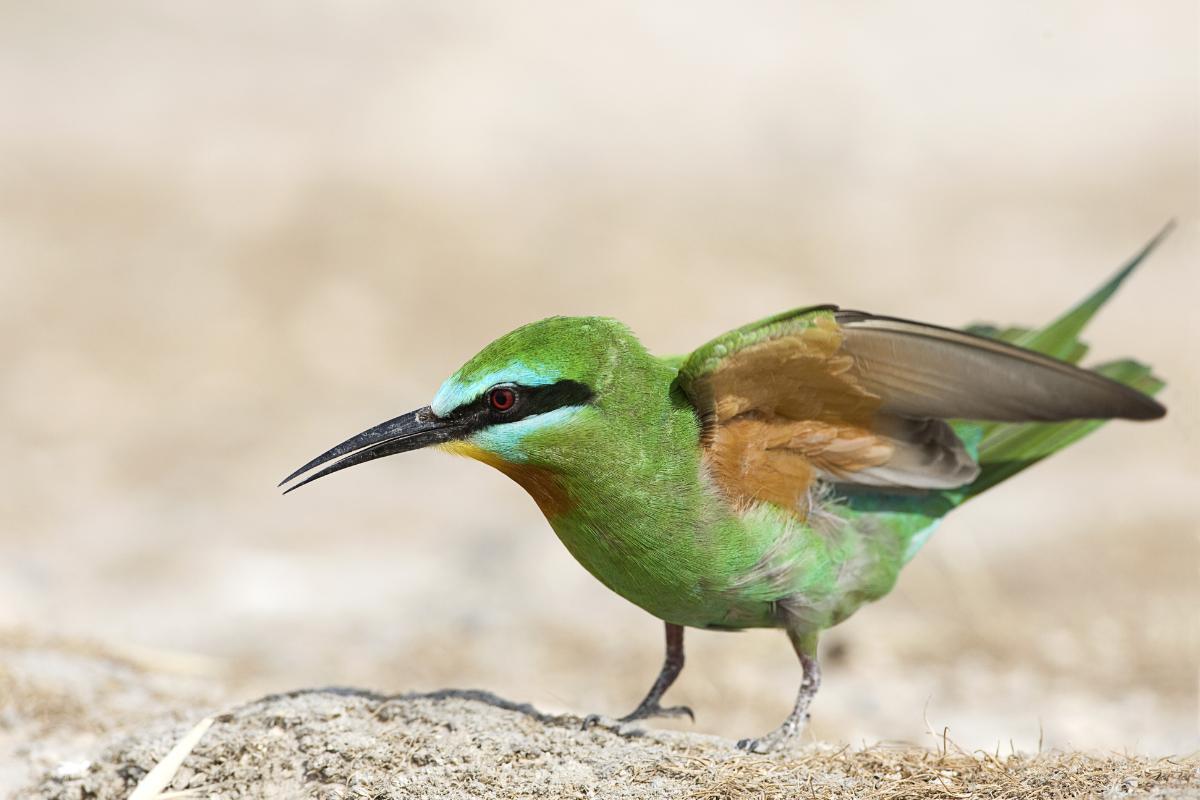 - Abejaruco arcoíris (Merops ornatus): habita en Australia y Nueva Guinea, e inicia la reproducción en primavera, aproximadamente de septiembre a noviembre. La hembra pone entre 3 y 7 huevos, y las crías permanecen en la madriguera cerca de un mes antes de salir, recibiendo alimentación tanto de los padres como de un macho que actúa como ayudante durante varias semanas más.