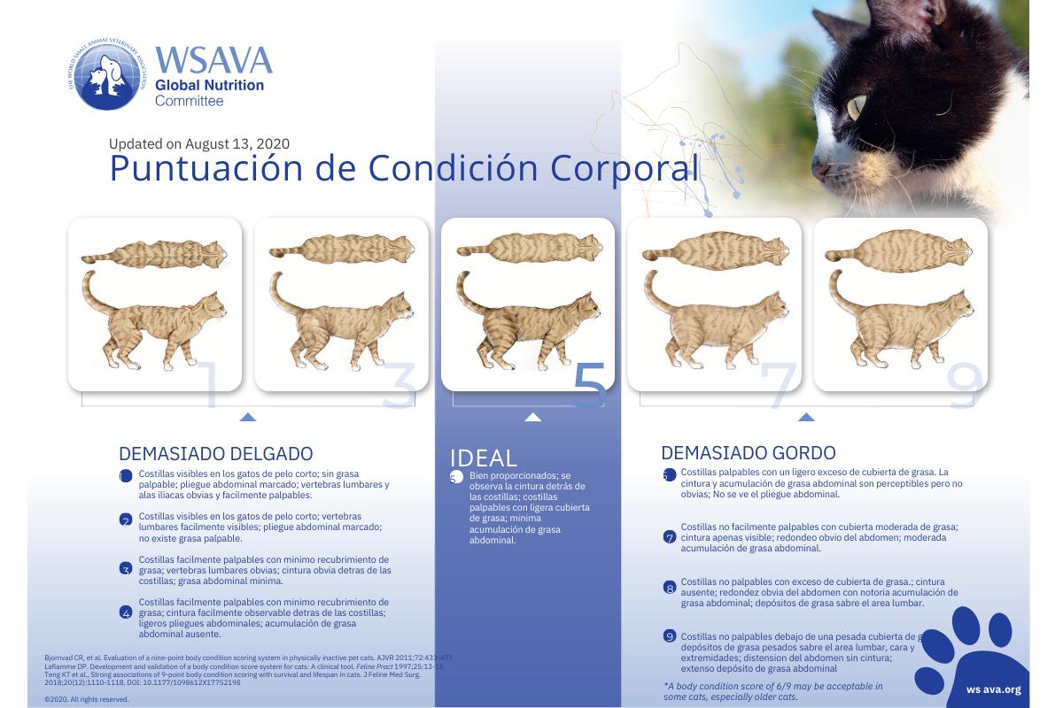 En la práctica veterinaria rutinaria, se utilizan tablas de peso en gatos o tablas de índices de condición corporal visuales, y se caracteriza por ser un método que guarda relación con la cantidad de grasa magra. Es de tipo semicuantitativo realizado mediante un inspección visual de nuestros gatos, clasificando en una escala de 1 a 9 puntos, siendo el número 1 el mayor grado de emaciación y siendo 9 el de mayor obesidad.
