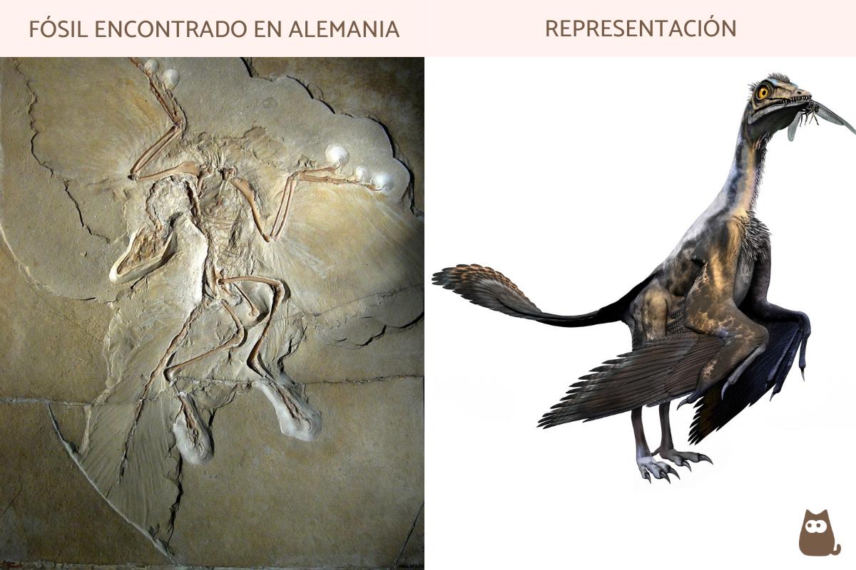 Una de las primeras propuestas de esta relación se hizo a partir del hallazgo de Archaeopteryx, que correspondió con un pequeño dinosaurio muy similar a un ave, encontrado en Alemania a principios de 1860. El nombre hace referencia a la combinación de palabras griegas que significan "plumas" o "alas antiguas". También eventualmente se le llama Urvogel, que en alemán se traduce como "pájaro primitivo". Este género ha sido considerado una pieza clave en la transición entre dinosaurios y aves, ya que en el mismo se han identificado una serie de características anatómicas de ambos grupos. Así, Archaeopteryx alcanzó el tamaño aproximado de un cuervo actual, pesaba alrededor de 1 kg y tenía plumas con ciertas semejanzas a las que poseen las aves actuales. Sin embargo, se ha estimado que este animal realmente no volaba como las especies que lo hacen hoy en día, pero sí lograba movilizarse a través del aire en distancias cortas, algo que también se ha propuesto para algunos de sus parientes, lo que pudo haber correspondido como una preparación para un posterior vuelo real en las aves. En cuanto a los rasgos que compartía con dinosaurios no aviares, encontramos la presencia de garras, dientes (pequeños), una larga cola con hueso y ausencia de huesos huecos.