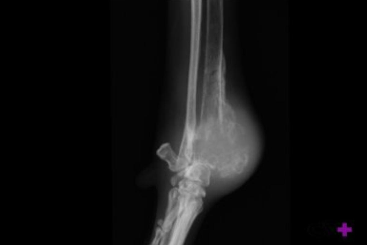 - Radiografía: las lesiones con una imagen de “apolillado”, con márgenes irregulares y mal definidos, especialmente cuando aparecen en las localizaciones más frecuentes de este tumor, nos hacen sospechar de la existencia de un osteosarcoma. Además, mediante la radiografía en ocasiones pueden observarse fracturas, puesto que un pequeño porcentaje de perros con osteosarcoma pueden presentar fracturas patológicas, es decir, fracturas originadas a raíz del daño óseo causado por el tumor. Cabe mencionar que las pruebas por imagen permiten realizar un diagnóstico presuntivo, pero para alcanzar el diagnóstico definitivo es necesario realizar las siguientes pruebas.