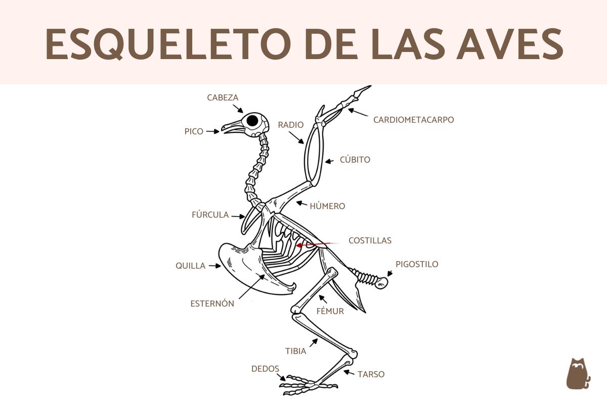 El esqueleto de las aves es una estructura altamente especializada que les proporciona soporte, protección y movilidad necesarios para el vuelo y otras actividades. Presenta características únicas y adaptaciones que les permiten volar de manera eficiente y adaptarse a diferentes entornos. Es ligero y rígido al mismo tiempo. Está compuesto por huesos huecos y delgados que reducen el peso total del esqueleto sin comprometer su resistencia. Además, se observa la fusión y reducción de huesos en diversas partes del cuerpo para aumentar la eficiencia del vuelo y reducir el peso. Algunas vértebras se fusionan, proporcionando estabilidad durante el vuelo.
