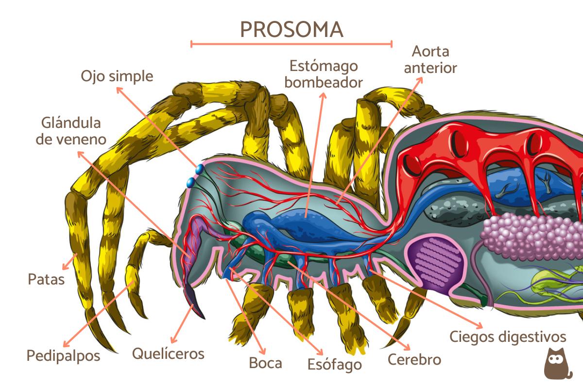 El prosoma, a su vez, está constituido por distintas partes, tanto externas como internas. Así pues, conozcamos los órganos o partes conforman el prosoma: