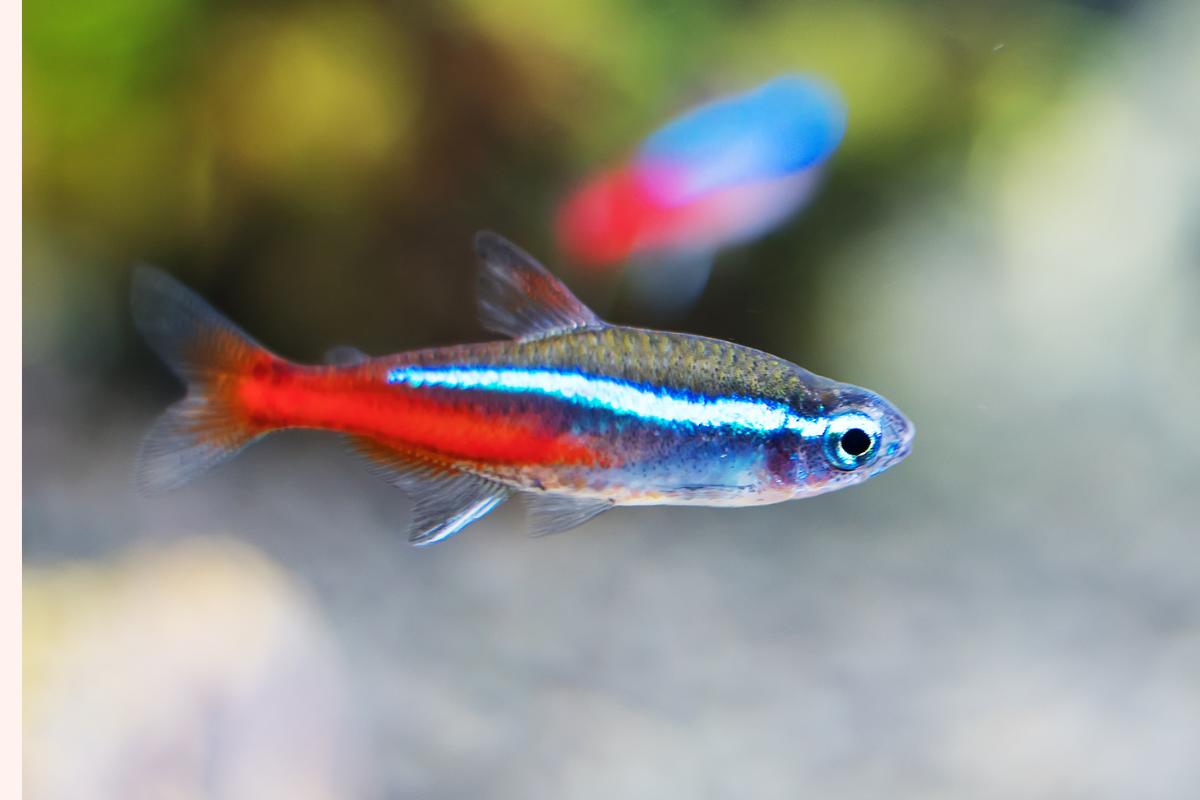 El tetra neón es un pequeño pez tropical de agua dulce originario de los arroyos amazónicos de Brasil, Colombia y Perú. Es famoso por su llamativo colorido, que incluye una franja azul brillante y otra roja, lo que le permite destacar en aguas oscuras y lo convierte en una especie muy popular en acuarios. Su cuerpo es parcialmente transparente, excepto por las franjas iridiscentes, que presentan variaciones según la luz. Estas franjas se tornan grises durante el descanso nocturno y recuperan su brillo al activarse. Alcanza un tamaño de hasta 4 cm y presenta un leve dimorfismo sexual, siendo las hembras ligeramente más redondeadas.