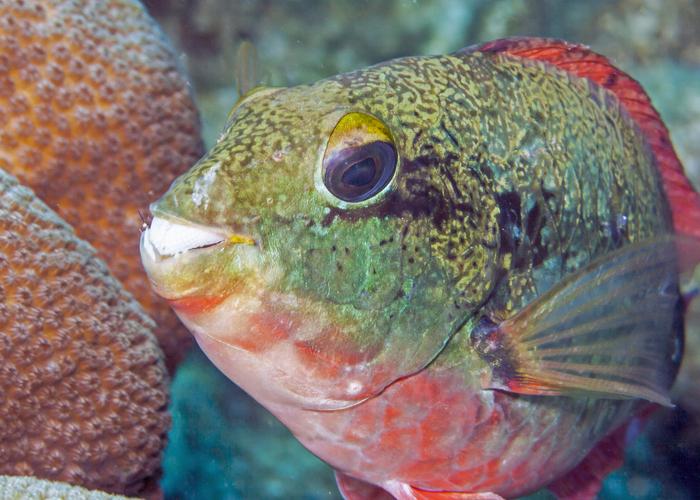 Este pez de la familia Scaridae es endémico del oeste del océano Atlántico, donde se encuentra desde Bermudas hasta Brasil, incluyendo el Caribe. Puede habitar hasta más de 70 metros de profundidad, pero en general se encuentra en zonas de corales, de algas y de plantas marinas, de las cuales se alimenta. Posee cerca de 30 cm de longitud y un color azulado rojizo en todo su cuerpo, las aletas son rojas y cuenta con una característica mancha negra detrás del opérculo, aunque algunos individuos pueden no tenerla. Los juveniles, por su parte, son de color más pardo marrón y el vientre rojizo.
