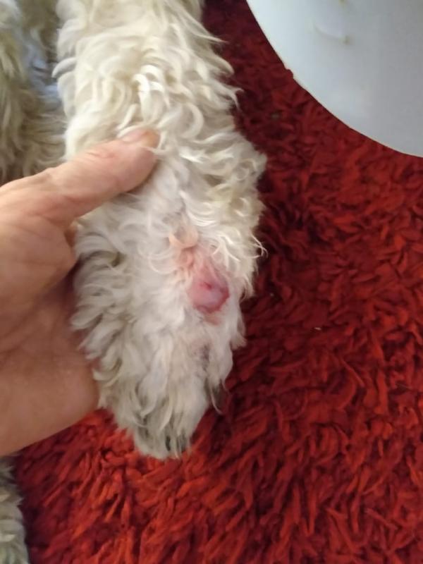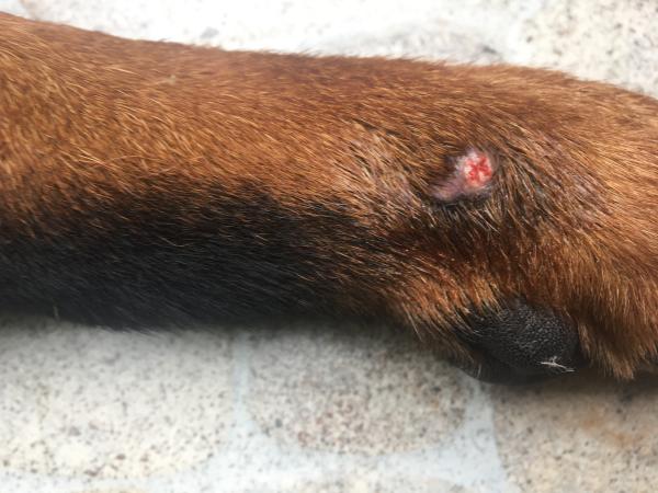 Buenas tardes, quisiera saber que es lo que tiene mi perro porque ya hace una semana que lo trato y la primera lesión seco pero apareció en paralelo está más arriba de su mano