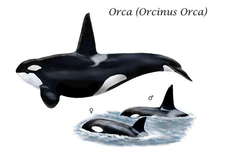 Con su coloración blanca y negra, las orcas o ballenas asesinas son uno de los mamíferos acuáticos más fácilmente reconocibles. Las orcas son una especie de delfín con una longitud corporal máxima de 9 metros en machos y 7,7 metros en hembras. Además, incrementando el dimorfismo sexual, los machos desarrollan unas aletas mucho más grandes que la de las hembras, incluyendo las aletas pectorales, la cola y la aleta dorsal, la cual puede llegar a medir 1,8 metros en los machos. Las orcas recién nacidas pesan aproximadamente 200 kilogramos y pueden medir entre 2 y 2,5 metros de longitud. Como dato curioso, un estudio de orcas en cautividad reveló que las hembras tienen mayor tamaño que los machos hasta los 6 años de edad.