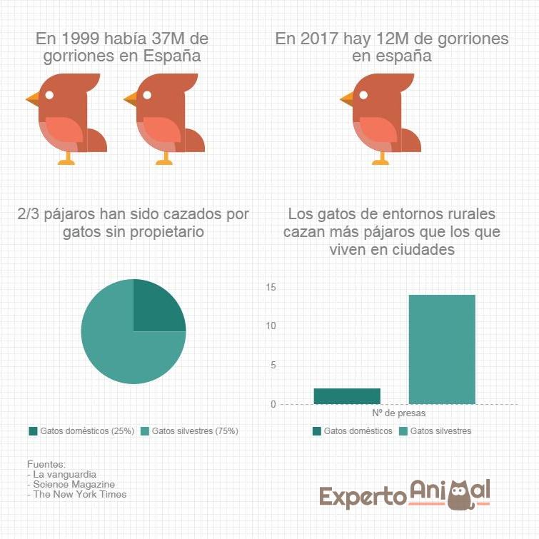 El estudio "The impact of free-ranging domestic cats on wildlife of the United States" publicado por la revista Journal of Nature Communications declara que los gatos matan aves durante los primeros años de vida, cuando son suficientemente ágiles como para brincar encima de ellas. También se explica que 2 de cada 3 aves fueron cazadas por gatos callejeros. Según el biólogo Roger Tabor, un gato en un pueblo matará a un promedio de 14 aves, mientras que un gato en la ciudad únicamente 2.