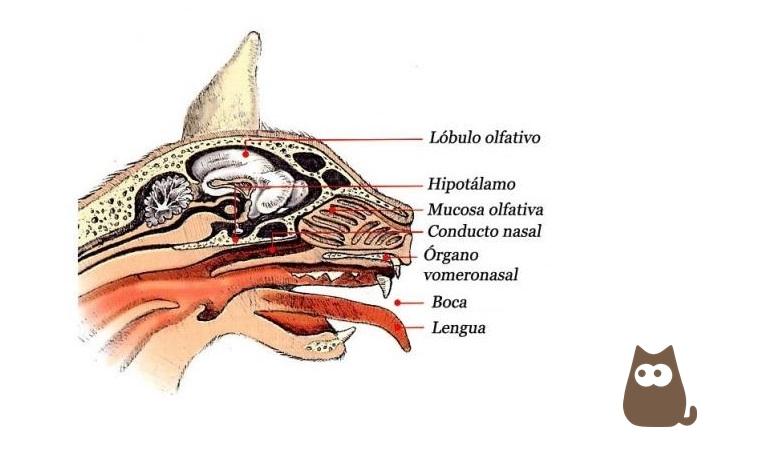 En mamíferos, las feromonas son detectadas a través del órgano vomeronasal u órgano de Jacobson, localizado en la boca, al final del paladar duro, por lo que es normal ver a un gato oler algo con la boca abierta.