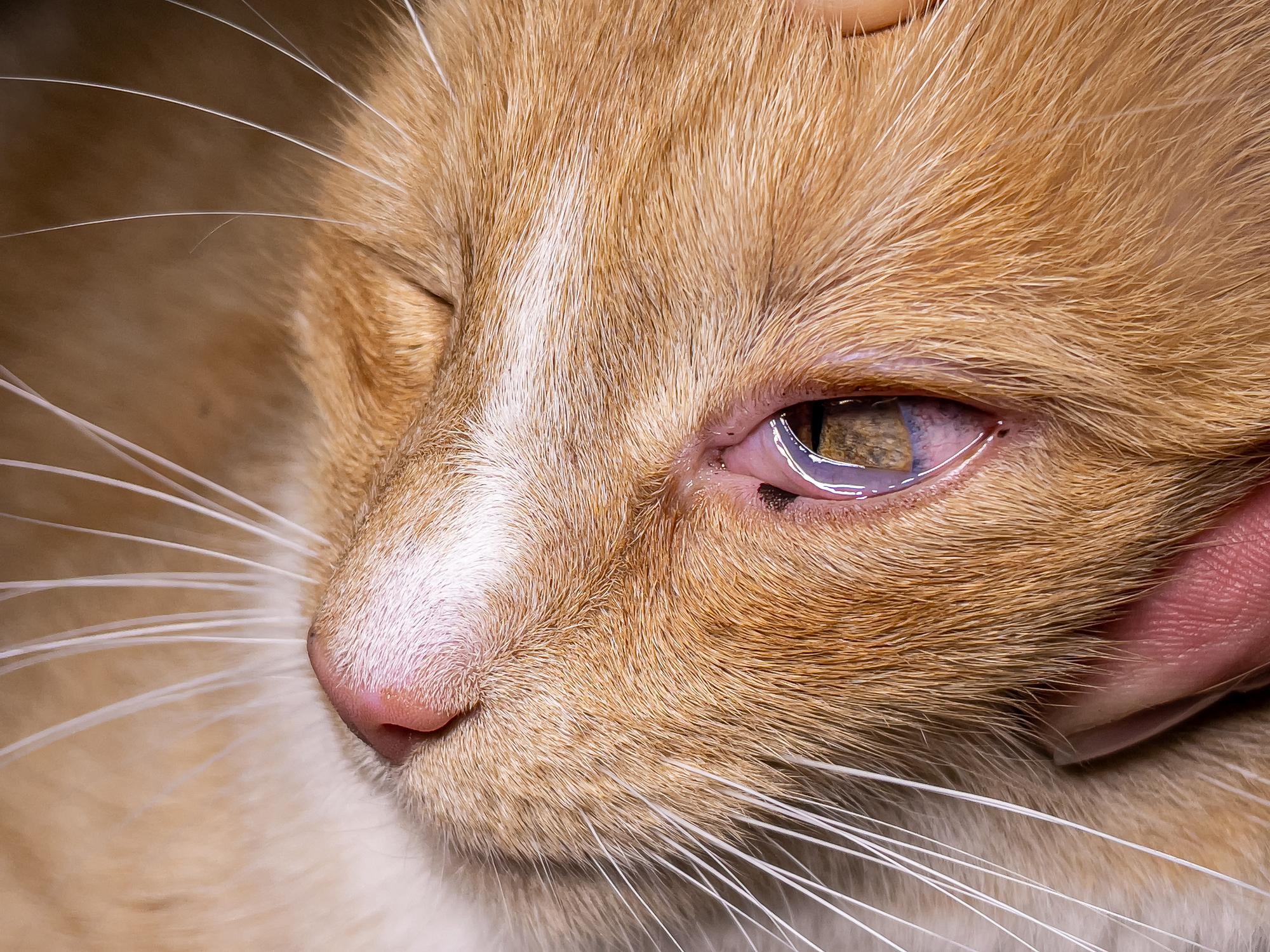- Tercer párpado visible (el minino suele tener su tercer parpado siempre visible en un intento de proteger su ojo).
