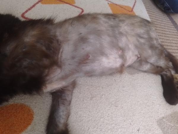 Hola, mi gato tiene una parte pelada desde hace unos 4 días, pensé que se había rasguñado pero desde hoy en la mañana me di cuenta que se ha ampliado, y no solo es la parte rojiza sino también al rededor que es blanco, me fije y tiene pequeños pelitos aún. Me podría decir que es lo que podría tener :(