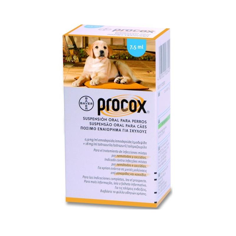 Procox® es un medicamento antiparasitario nematocida y coccidiocida en forma de suspensión oleosa amarillenta o blanquicina, compuesta por dos principios activos: la emodepsida (0,9 mg/ml) y el toltrazurilo (18 mg/ml).