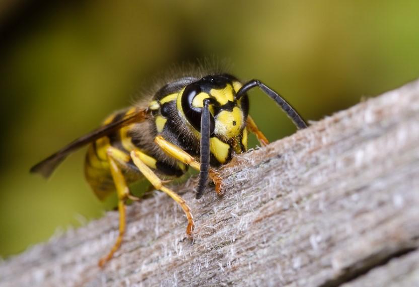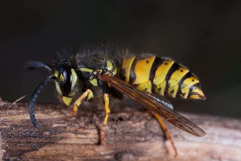 La avispa común (Vespula vulgaris) es una especie que mide 17 mm de longitud. Se caracteriza por poseer cuerpo negro con manchas amarillas. Habita en árboles y arbustos, pero también en las paredes y rincones de la casa, en agujeros, debajo de los pisos, etc.