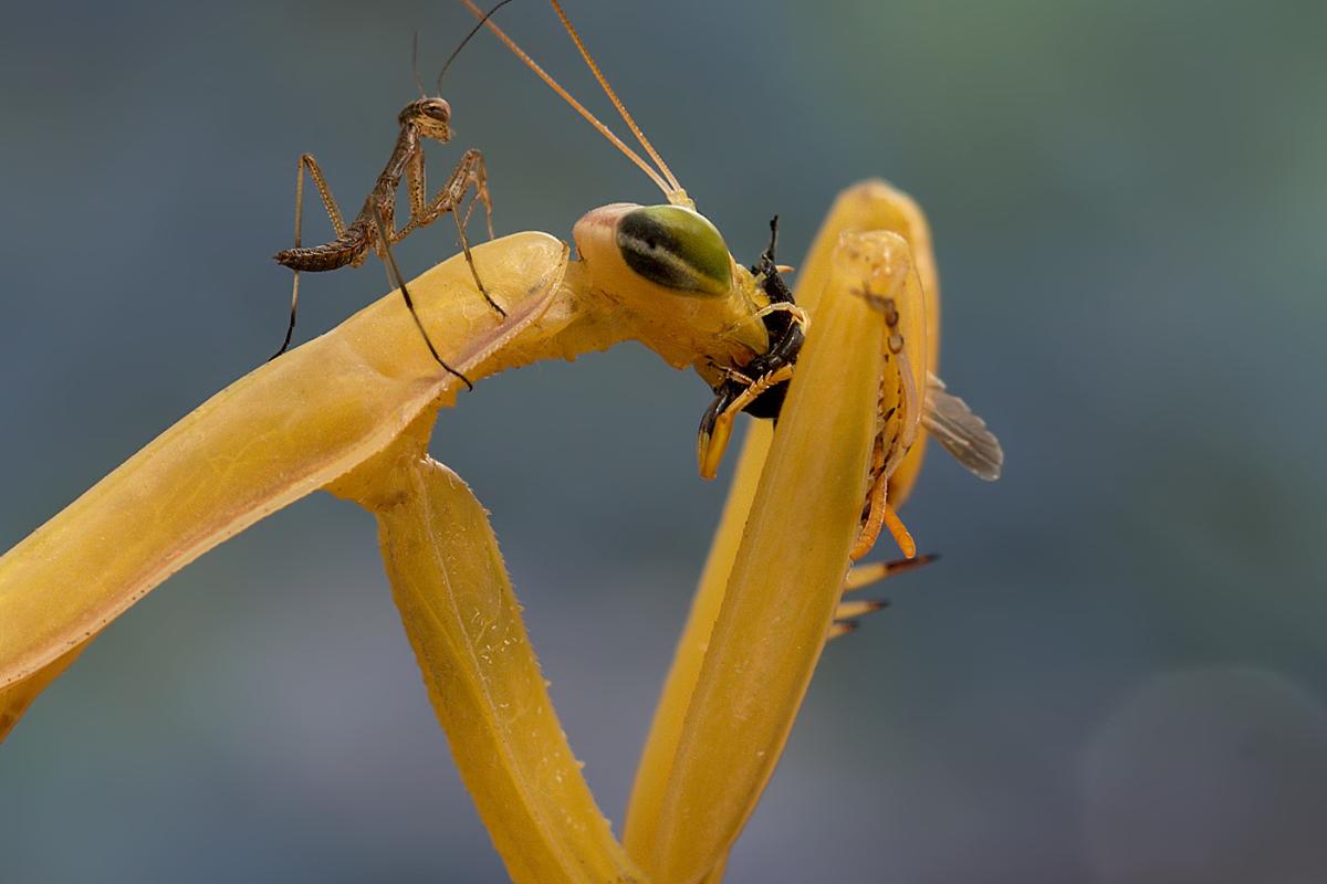 Un comportamiento conocido de las mantis, es que en algunos casos, especialmente durante el apareamiento, las hembras pueden consumir al macho después de la cópula. Esto puede proporcionar nutrientes adicionales para la hembra, lo que puede ser beneficioso para su fertilidad y la producción de huevos.
