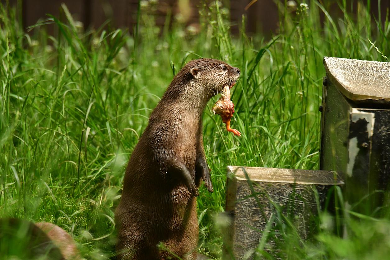 Un primer ejemplo que podemos mencionar es la nutria oriental de garras pequeñas (Amblonyx cinereus), que, aunque puede tener cierta presencia costera, se desarrolla principalmente en hábitats de agua dulce. Se alimenta de: