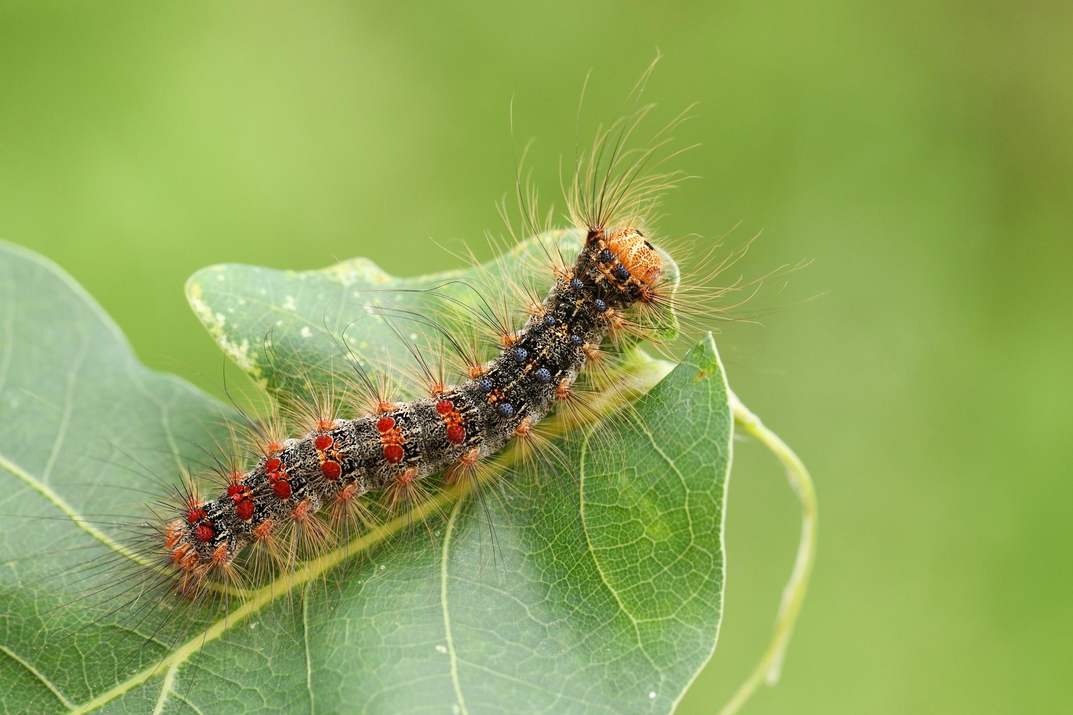 - Polilla gitana (Lymantria dispar): las orugas son defoliadoras intensivas de árboles y pueden causar daños importantes en bosques. Algunas de las especies que consumen son roble (Quercus), árboles de hoja ancha de alber (Alnus rubra), abeto de Douglas (Pseudotsuga) y árboles de agujas de abeto occidental (Tsuga heterophylla). Es la que observamos en la imagen.