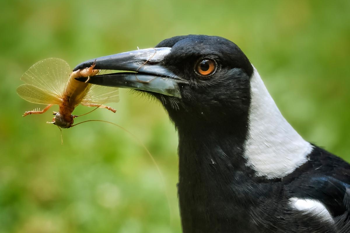 - Urraca australiana: se alimenta de insectos y frutos, pero en entornos suburbanos aprovecha también comida suplementaria ofrecida por personas.