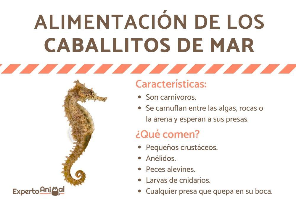 Los hipocampos son animales carnívoros y voraces depredadores de otros organismos que viven en el fondo marino. Pero, ¿qué comen los caballitos de mar exactamente? Su comida favorita son los pequeños crustáceos, aunque el único requisito que exigen a sus presas es que les quepan en la boca. Así, en la alimentación de los caballitos de mar se pueden encontrar anélidos, larvas de cnidarios, peces alevines, etc.