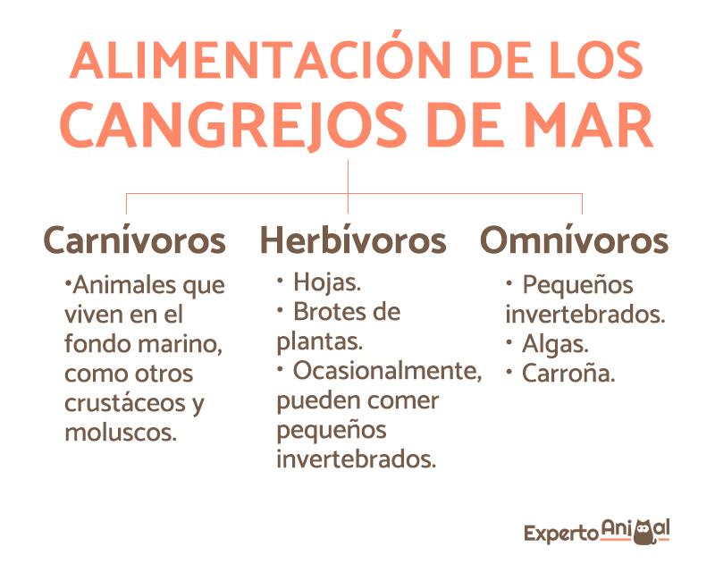 Los cangrejos carnívoros son, normalmente, bentónicos. Por ello, se alimentan de animales que viven en el fondo marino, como pequeños crustáceos y moluscos. Sin embargo, es cierto que algunos, de manera ocasional, pueden comer algas.