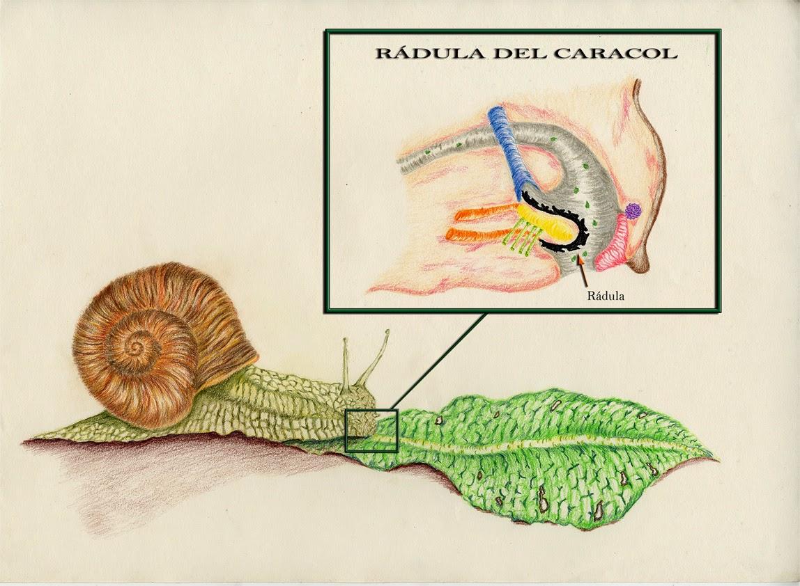 Una vez el caracol ha conseguido su alimento, lo lleva hasta la rádula, donde lo raspa una y otra vez hasta que lo deshace lo suficiente para continuar con el proceso de digestión. Los dientes del caracol sufren mucho daño conforme pasa el tiempo, debido a esto, son sustituidos continuamente por otros.