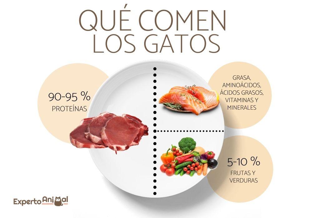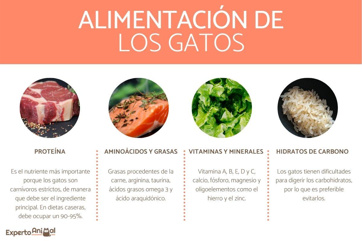 Los gatos son carnívoros estrictos y tienen elevadas necesidades proteicas (al menos un 30 % del total de la dieta), junto con taurina, arginina, ácido araquidónico y vitamina A, que obtienen a través de la ingesta de tejido animal. Así pues, las necesidades nutricionales de los gatos se dividen en proteínas, aminoácidos esenciales, grasa, ácidos grasos, hidratos de carbono, vitaminas y minerales.