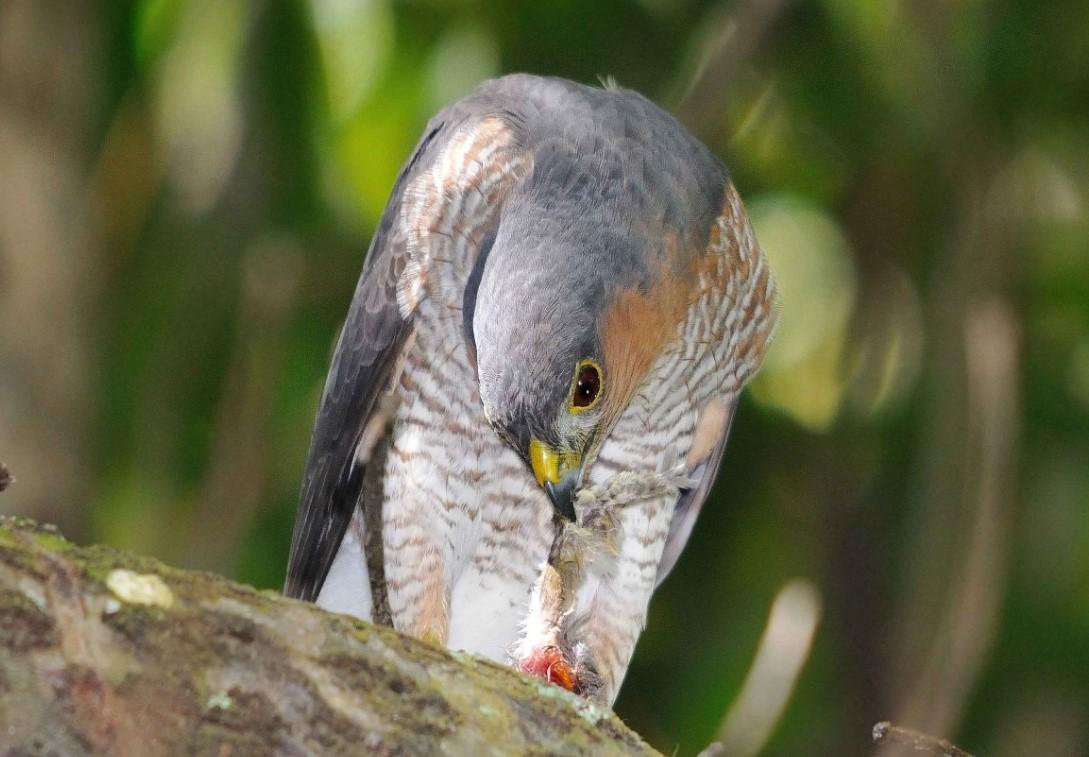 - Halcón murcielaguero (Falco rufigularis): aunque se le conoce como halcón, es uno de los Falconiformes más pequeños. Su especialidad es cazar murciélagos durante el alba y el crepúsculo. También puede comer pequeñas aves, como los vencejos, e insectos, sobre todo libélulas y polillas.