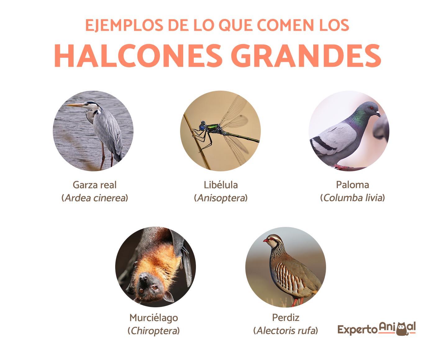 En este apartado vamos a ver qué comen los halcones propiamente dichos, es decir, los Falconiformes de mayor tamaño. En muchos casos, se trata de aves que superan los 40 centímetros. Debido a ello, sus presas suelen ser más grandes que las de las aves anteriores. Como los alcotanes, suele cazarlas al vuelo, pudiendo llevar a cabo espectaculares persecuciones.