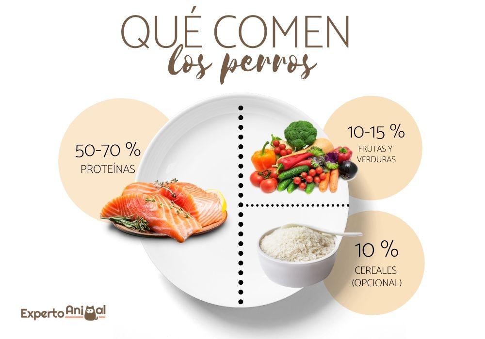 La dieta de un perro debe incluir diferentes ingredientes como proteínas, cereales, frutas, verduras y ácidos grasos. Además, debería evitarse en la mayor medida de lo posible el uso de conservantes o colorantes artificiales, ya que estos aditivos pueden causar problemas de salud. El porcentaje que se necesita de cada nutriente es diferente, como veremos a continuación: