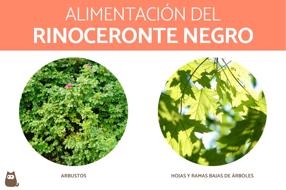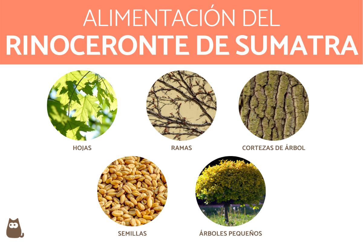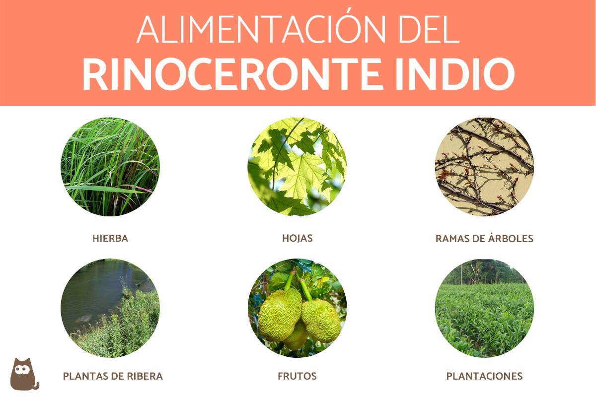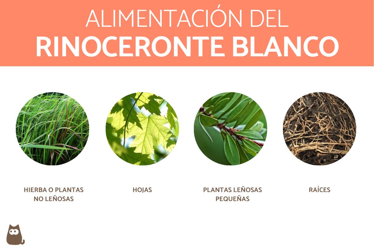 Los rinocerontes son animales herbívoros que, para mantener sus cuerpos de grandes dimensiones, dependen del consumo de altos contenidos de materia vegetal, que pueden ser partes blandas y nutritivas de las plantas, aunque en casos de escasez ingieren alimentos altos en fibras que procesan en su sistema digestivo.