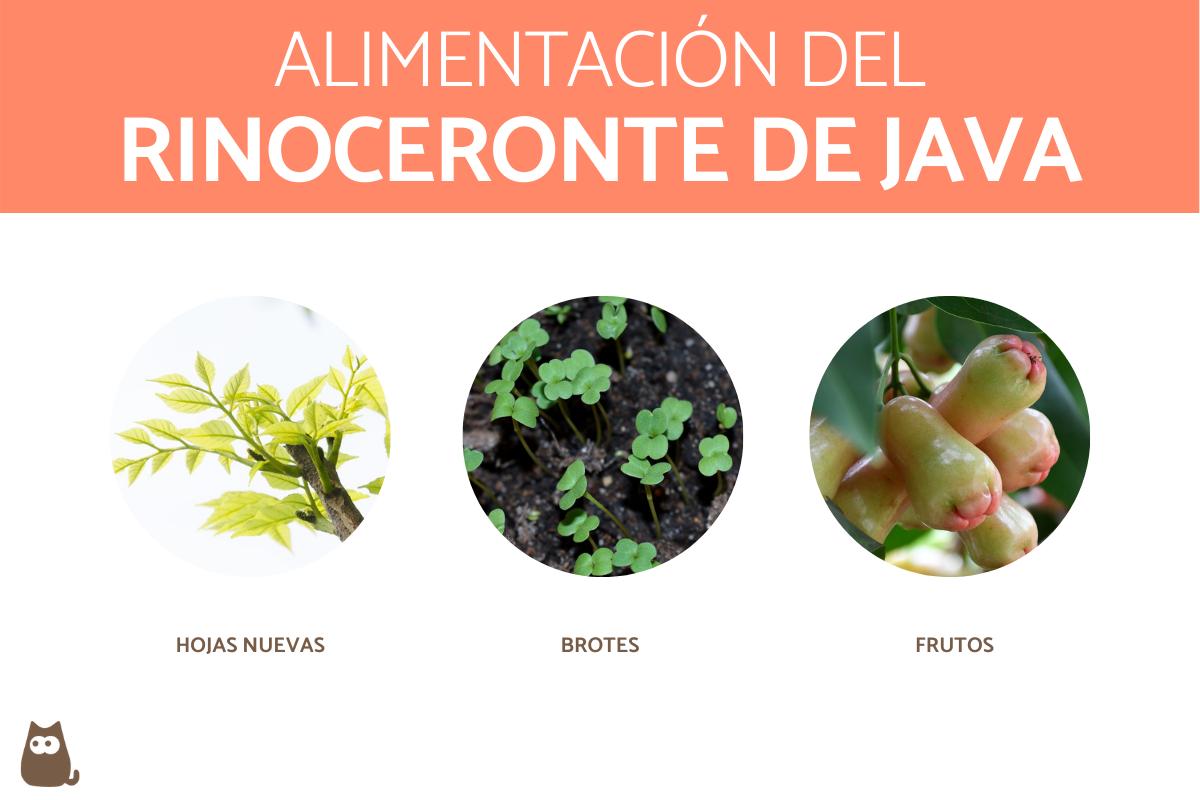 El rinoceronte de Java se alimenta de hojas nuevas, brotes y frutos. También requiere del consumo de sal para obtener ciertos nutrientes, pero debido a la ausencia de reservas de este compuesto en la isla, se le ha visto tomar agua de mar.