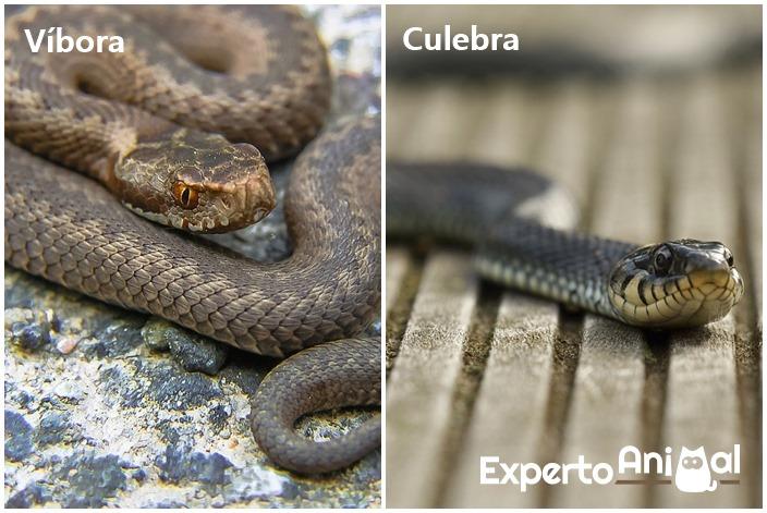 - Víboras: a diferencia de las culebras, las víboras poseen escamas más pequeñas en la cabeza, son más pequeñas y muestran pupilas alargadas, como los gatos. Además los colmillos son notoriamente más largos. Sí son venenosas.