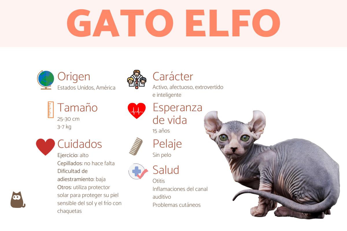 El gato elfo es una mezcla entre el gato sphynx y el gato curl americano. Es un tipo de gato sin pelo como el sphynx, pero con las particulares orejas del curl americano, es decir, curvadas hacia atrás. Aunque estas dos características del gato elfo requieren de unos cuidados más exhaustivos para prevenir patologías, se trata de un gato mediano con un carácter excepcional, siendo un maravilloso compañero de vida, afectuoso, simpático, activo, inteligente y muy sociable, que se adapta fácilmente a las nuevas situaciones y se lleva bien con todo tipo de personas.
