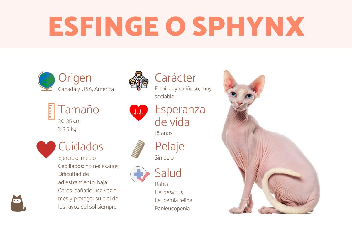 El gato sphynx o gato esfinge es un gato realmente único en el mundo. Fue el primero en ser aceptado como raza sin pelo o sin pelaje aparente y lo que es seguro, es que crean agrado y desagrado a la vez por parte de la sociedad humana. Muchos profesionales sugieren que proviene de la raza de gato devon rex, con la que comparten características muy similares. Aparecieron de forma natural a lo largo de la historia ya que su falta de pelaje es causa de una mutación, un proceso común en la evolución de cualquier especie. Fue en Canadá, cuando en los años 60 decidieron fijar y mantener las características de los gatos que no parecían tener pelo.