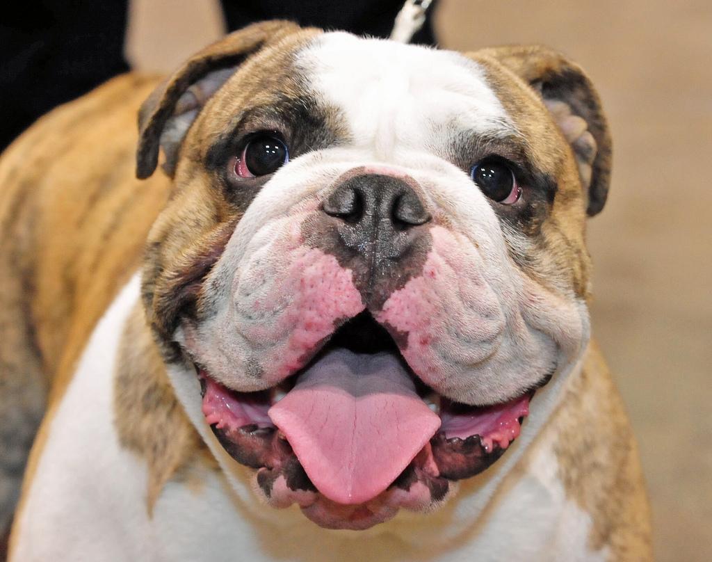 Éste es un perro de complexión pesada, estatura baja y pelo corto. A primera vista se aprecia que es un animal ancho, poderoso y compacto. La cabeza del bulldog es grande en proporción a su cuerpo y presenta arrugas sutiles tanto en la frente como en las mejillas. El stop es profundo y ancho. El cuello, grueso y fuerte, presenta abundante papada. La cara del bulldog inglés es sin duda su característica más distintiva. Es corta y tiene un hocico ancho y romo, que se inclina hacia arriba con prognatismo evidente. En teoría esta morfología ayuda al perro a morder sin soltar la presa, pero es poco probable que así sea y, de hecho, no es una morfología común en depredadores naturales. De cualquier manera, el mito sigue vigente. Los ojos redondos y medianos están bien separados entre sí y son muy oscuros, casi negros. No deben ser ni hundidos ni saltones. Por su parte, las orejas de inserción alta, son pequeñas, delgadas y en forma de rosa. Los belfos del bulldog inglés cuelgan hacia los lados, pero no en la parte frontal. La nariz es ancha y de color negro. Las mandíbulas son anchas, muy fuertes y cuadradas, y la inferior se extiende delante de la superior y se voltea hacia arriba.