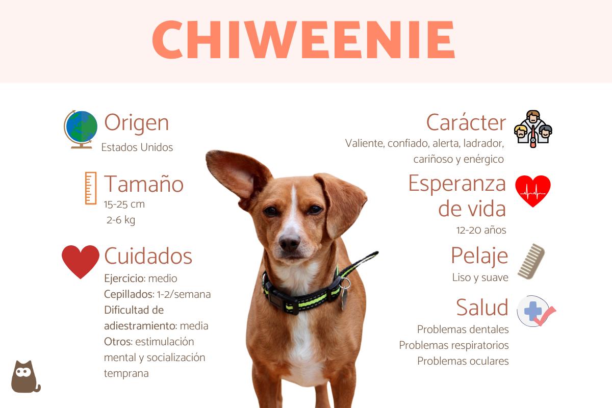 El chiweenie es un perro híbrido que se desarrolla a partir de cruces entre el chihuahua y el dachshund o teckel. Esta raza mixta se convirtió casi instantáneamente en un fenómeno de popularidad en los Estados Unidos y, poco a poco, ha ido ganando reconocimiento global. Sin duda, el pequeño tamaño y el aspecto sumamente tierno, principalmente en la etapa de cachorro, son grandes atractivos de estos peludos. Pero, también hay que destacar sus múltiples atributos como perro de compañía, destacando un temperamento alegre, protector y muy leal a los suyos. Si te gustaría saber más sobre esta raza americana, ¡sigue leyendo esta ficha del ExpertoAnimal y descubre las características y los cuidados del perro chiweenie!