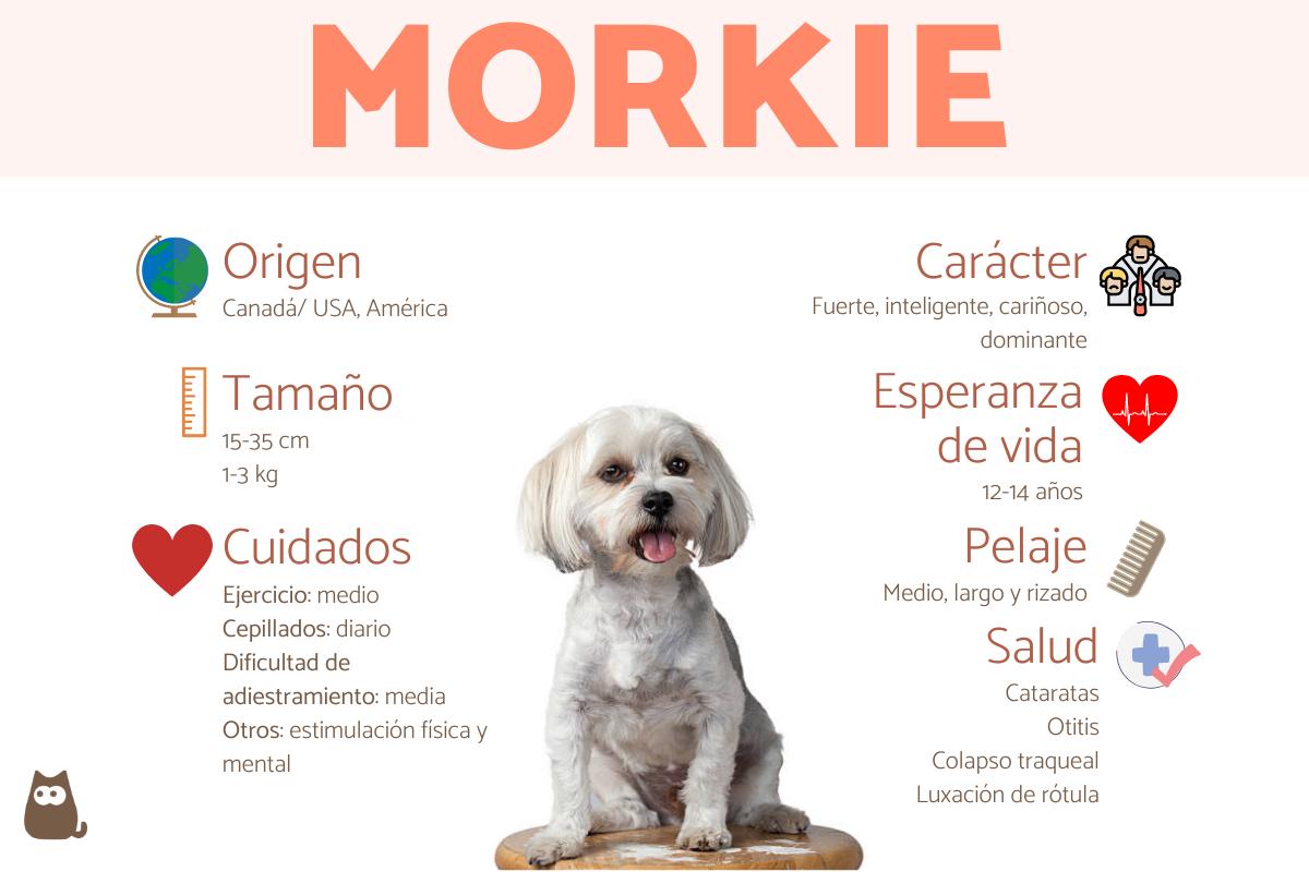 Un morkie es un tipo de perro de tamaño pequeño, cuyo peso se encuentra normalmente entre los 2,5 y los 5 kilogramos. Su altura a la cruz suele estar comprendida entre los 15 y los 31 centímetros. Por otro lado, su esperanza de vida media es de entre 10 y 13 años. Algunas de las características del perro morkie son: