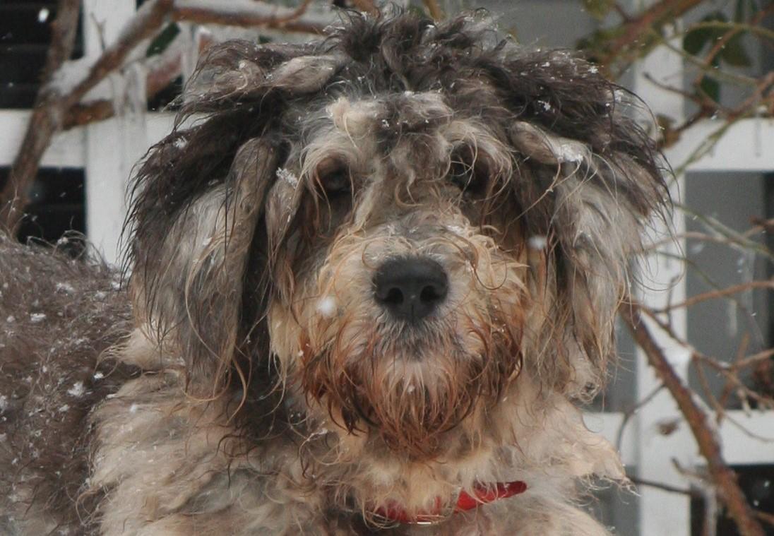 El pelaje es muy abundante, largo y de diferentes texturas en diferentes partes del cuerpo. En la parte anterior del tronco es áspero, similar al pelo de cabra. Sobre la cabeza, el pelo es menos áspero y cae cubriendo los ojos. En el resto del cuerpo, el pelo forma mechones. El pelaje puede ser gris con manchas grises de diferentes tonos, e incluso manchas negras. También puede ser negro completo, siempre que sea opaco. Las manchas blancas son aceptadas cuando no superan la quinta parte de la superficie total.