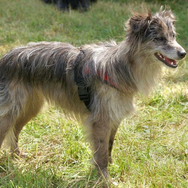 La cabeza de estos canes es triangular y la nariz negra. Los ojos, levemente almendrados, son de color pardo oscuro excepto en perros de pelaje azul entremezclado con negro, en los que pueden ser de diferentes colores. Las orejas son triangulares y cortas, y cuelgan a los dos lados de la cabeza o son parcialmente erguidas.