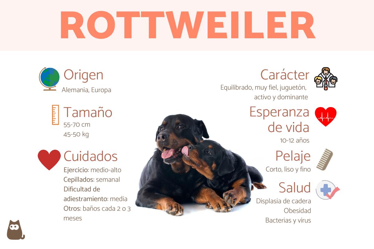 Para terminar con el perro rottweiler destacaremos que suele ser un perro relativamente sano, con una esperanza de vida que ronda los 10 años. Las enfermedades más habituales en esta raza suelen ser la displasia de cadera o el cáncer aunque mediante visitas regulares al veterinario podemos detectar rápidamente su aparición.