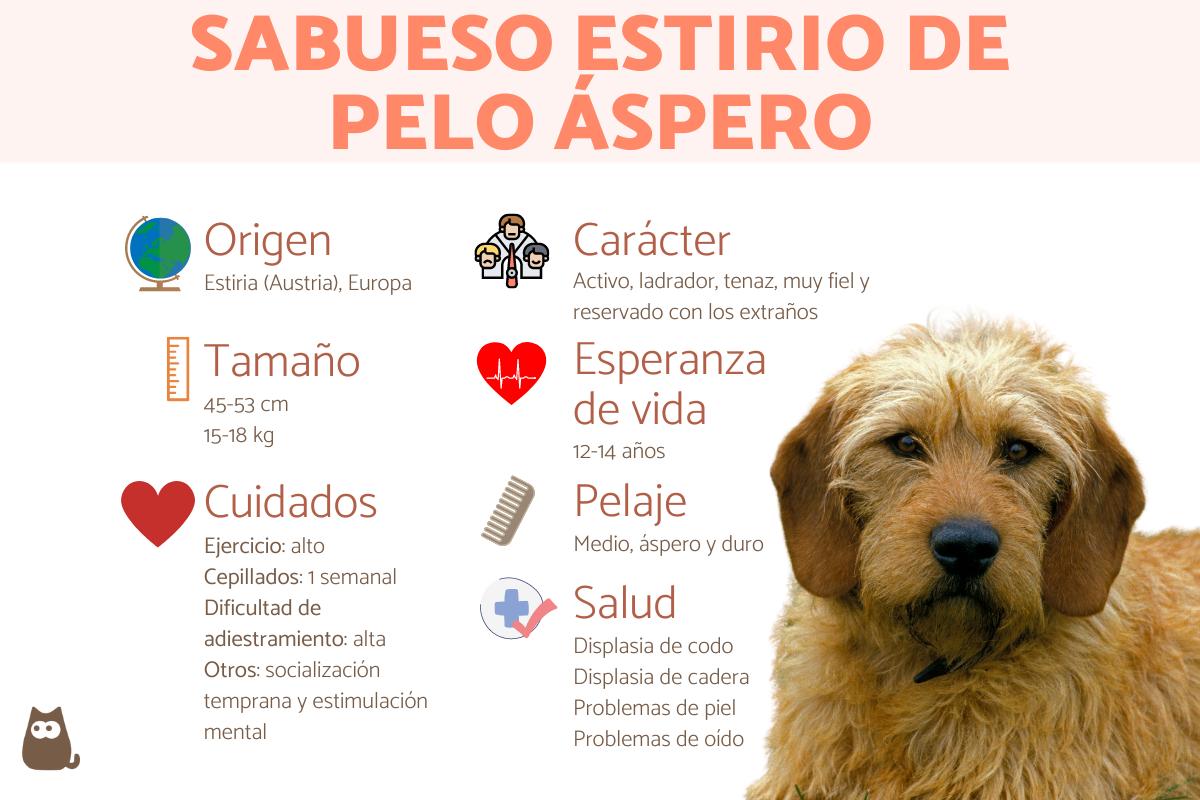 El sabueso estirio de pelo duro, o steirische rauhhaarbracke, es una raza de perro originaria de Austria y creada para la caza. Como perro sabueso que es, destaca por su excelente olfato y capacidad de rastreo, pero también por las características de su manto: áspero y duro. Aunque estamos ante un perro independiente y reservado, es también muy cariñoso con las personas en las que confía. ¿Quieres saber más? Sigue leyendo y descubre en esta ficha de ExpertoAnimal todas las características del sabueso estirio de pelo áspero, sus cuidados y mucho más.