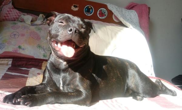Se llama Padme, es una Staffordshire bull terrier de 1 año y medio. Con toda sinceridad, estoy muy contenta con su compañía.